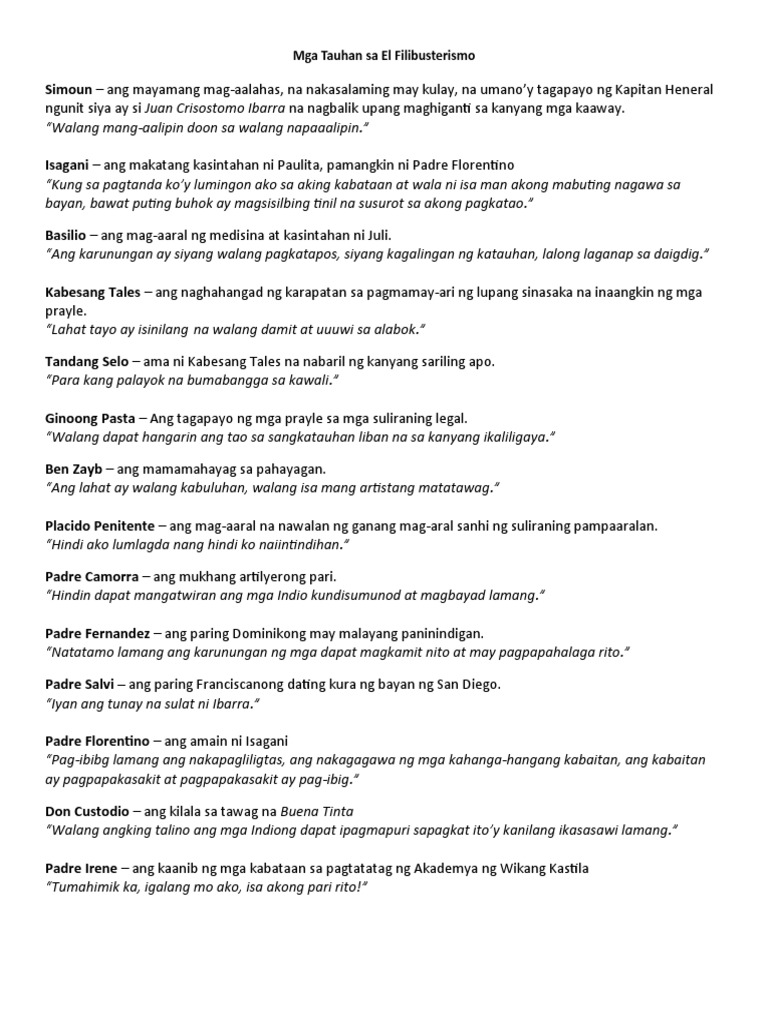 Kabilang na dyan sina Simoun Crisostomo Ibarra Basilio Donya Consolacion Kapitan Tiago ang mga prayle at marami pang iba. Narito at iyong basahin ang aming ginawang El Filibusterismo tauhan. Kilala ang paring ito na malapit sa ibat ibang tauhan sa nobela at karaniwang nagbibigay ng impormasyon kung kani-kanino na kung minsan ay nagiging dahilan ng mga kaguluhan.