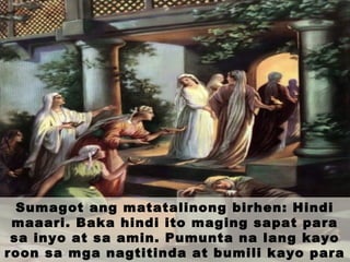Sa Ang parabula ng sampung dalaga sino sa mga tauhan ang kumakatawan sa ating Panginoon. Kasalan ng mga hudyo. Ang lima naman ay mga hangal.