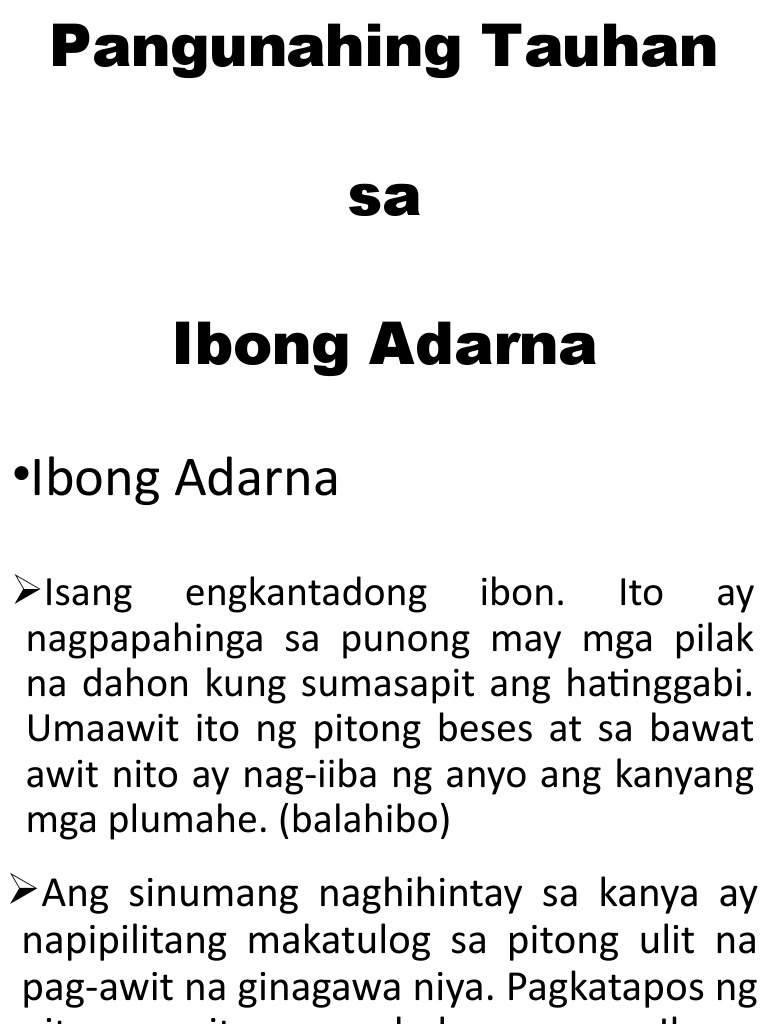 Iba pang mga Characters. View MGA_TAUHAN_NG_IBONG_ADARNApptx from FILIPINO 115 at Don Mariano Marcos Memorial State University. Tamang sagot sa tanong.